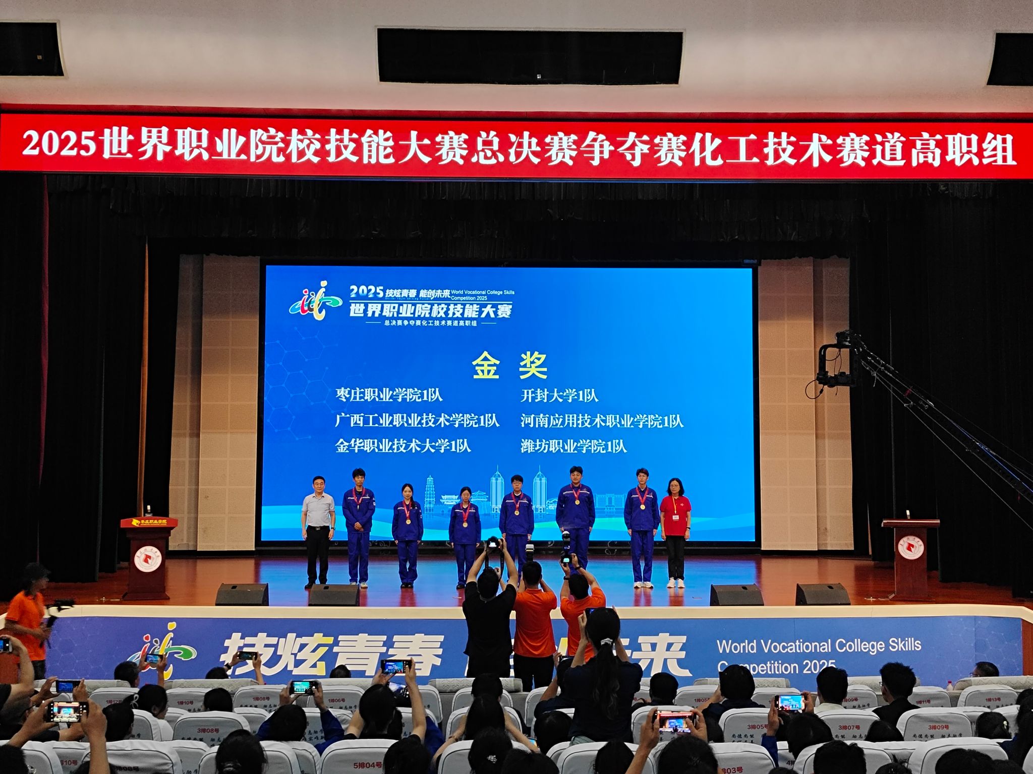 8月26日至30日,2025年世界职业院校技能大赛总决赛争夺赛“化工技术”赛道高职1组比赛在枣庄职业学院举行,潍坊市化工职教集团理事长单位潍坊职业学院化学工程学院应用化工技术专业学生崔建龙、周世荣、张铭佳睿、李嘉仪组成的参赛团队,凭借出色发挥,从全国28个省(自治区、直辖市)的61支参赛队伍中脱颖而出,成功摘得该赛道金奖。