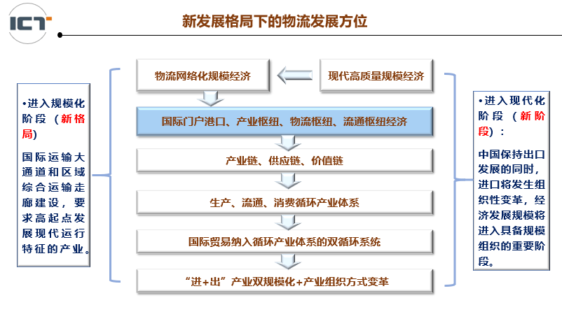 把全面的物流业发展方位,包括“十四五”对物流业发展的要求,我们做一个总结,就是这么一张表。右侧是进入现代化阶段,我们把它叫作新阶段。中国保持出口发展的同时,进口将发生组织性变革,经济发展规模将进入具备规模组织的重要阶段。左侧是进入规模化阶段,我们把它叫作新格局。国际运输大通道和区域综合运输走廊的建设成为重中之重,要高起点的发展现代运行特征的产业,现代物流是现代运行特征产业的核心。按照左右两侧的要求,我们把刚才讲的内容做一个归纳,就是现代高质量的规模经济需要物流网络化规模经济的发展和支撑。构建物流网络规模经济,就需要打造国际门户港口,包括海/河港、空港、内陆港;需要打造产业枢纽,比如洛阳就是空港+陆港+产业枢纽;需要打造物流枢纽,既为产业服务,又为区域服务;需要打造流通枢纽经济,这是最近我们正在做的现代流通体系规划里的概念。实际上发展这四个类型的枢纽经济,聚集要素,形成规模经济效应。而要聚集要素就必须延伸产业链、完善供应链和提升价值链,实现三链的有机融合和互动发展。而要实现三链有机融合,就需要生产、流通和消费循环产业体系建设,形成循环基础上的产业体系,而不是过去单纯生产环节、单纯流通产业的产业体系,是把生产和流通有机的串接起来。这样使得国际贸易才能够真正纳入到循环产业体系的双循环系统中,使得国际贸易成为中国既获取资源,又获得发展的重要保障。我们面临的是“进口+出口”的产业双规模化,将支撑双规模化循环产业组织方式变革。