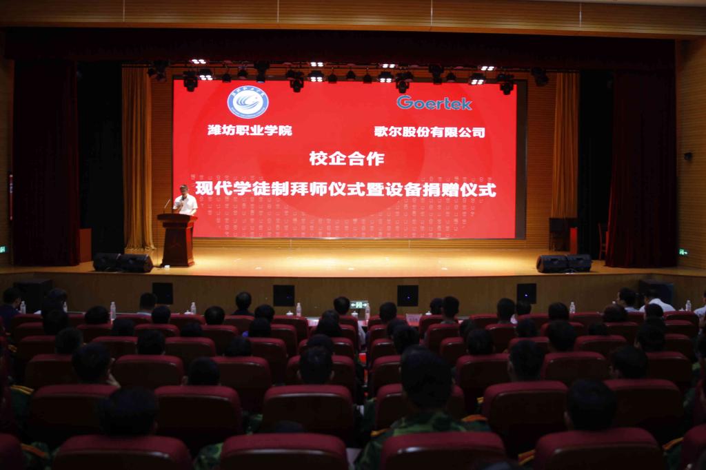 9月18日上午,潍坊职业学院与歌尔股份有限公司校企合作现代学徒制拜师暨设备捐赠仪式在滨海校区图书楼报告厅隆重举行,歌尔公司为我院捐赠680余万元设备。学院副院长贺志强、李瑞昌,歌尔精密制造事业群总经理刘凯,歌尔自动化事业群总经理吴爽昌出席,学生工作处、科技处、机电工程学院、歌尔公司校企合作负责人和机电工程学院师生代表、现代学徒制班全体学员参加了仪式。