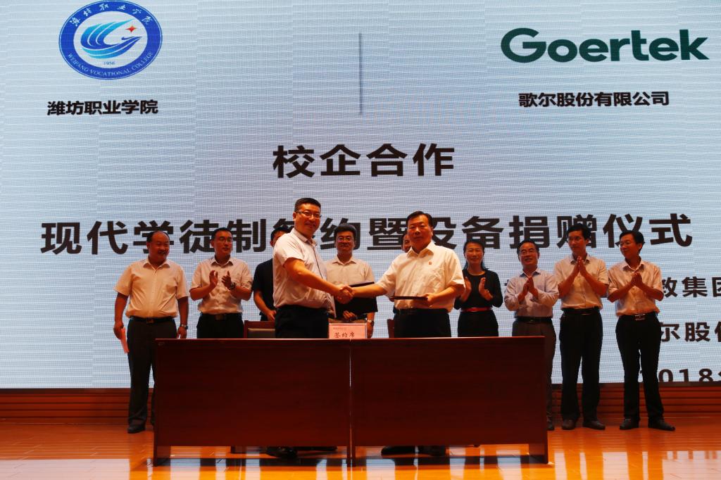 贺志强代表学院接受歌尔公司捐赠680余万元的数控及自动化设备,并与歌尔精密制造事业群总经理刘凯共同签署了《潍坊职业学院与歌尔股份有限公司现代学徒制人才培养协议》。