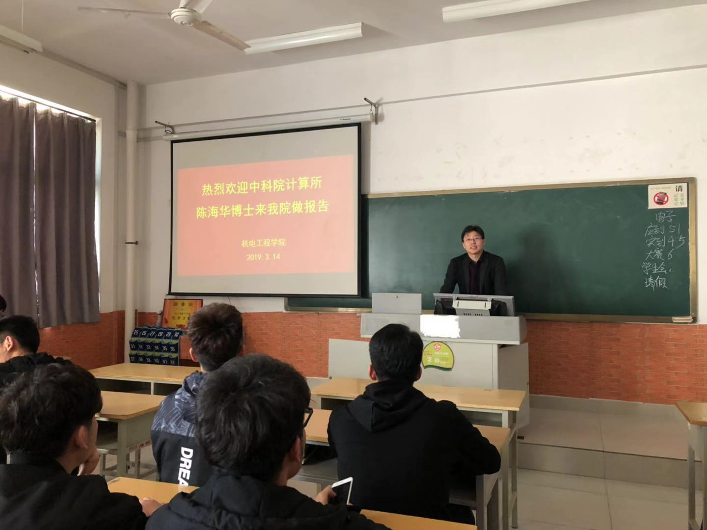 3月14日,中国科学院计算机技术研究所潍坊智能系统创新研究院常务副院长陈海华博士一行4人来到我院做专题报告,机电工程学院应用电子专业负责人、智能电子协会成员及部分在校生参加了此次报告会。