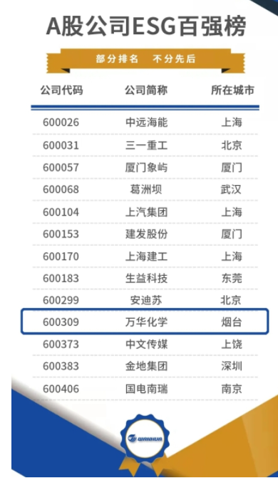 日前,由证券时报编制的《A股公司ESG百强榜》发布。凭借在环境(E)、社会(S)、公司治理(G)“三维”得分上的突出成绩,潍坊市化工职教集团副理事长单位万华化学(600309)荣登榜单。