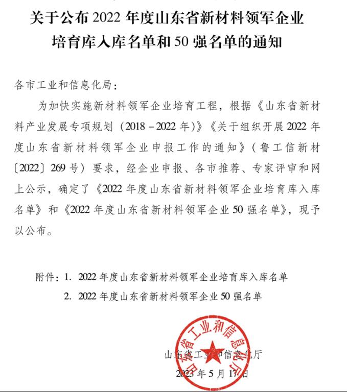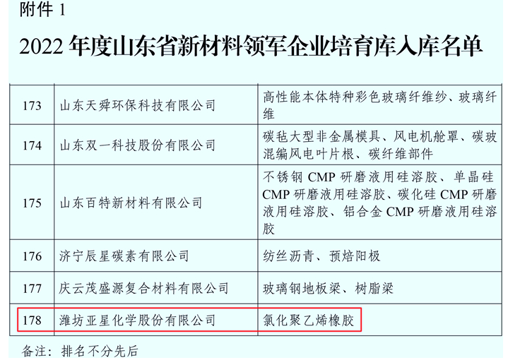 5月17日,山东省工业和信息化厅公布了“2022年度山东省新材料领军企业培育库入库名单”,潍坊市化工职教集团理事单位潍坊亚星化学榜上有名,充分体现了公司在氯化聚乙烯(CPE)行业的产品先进性和技术创新能力。