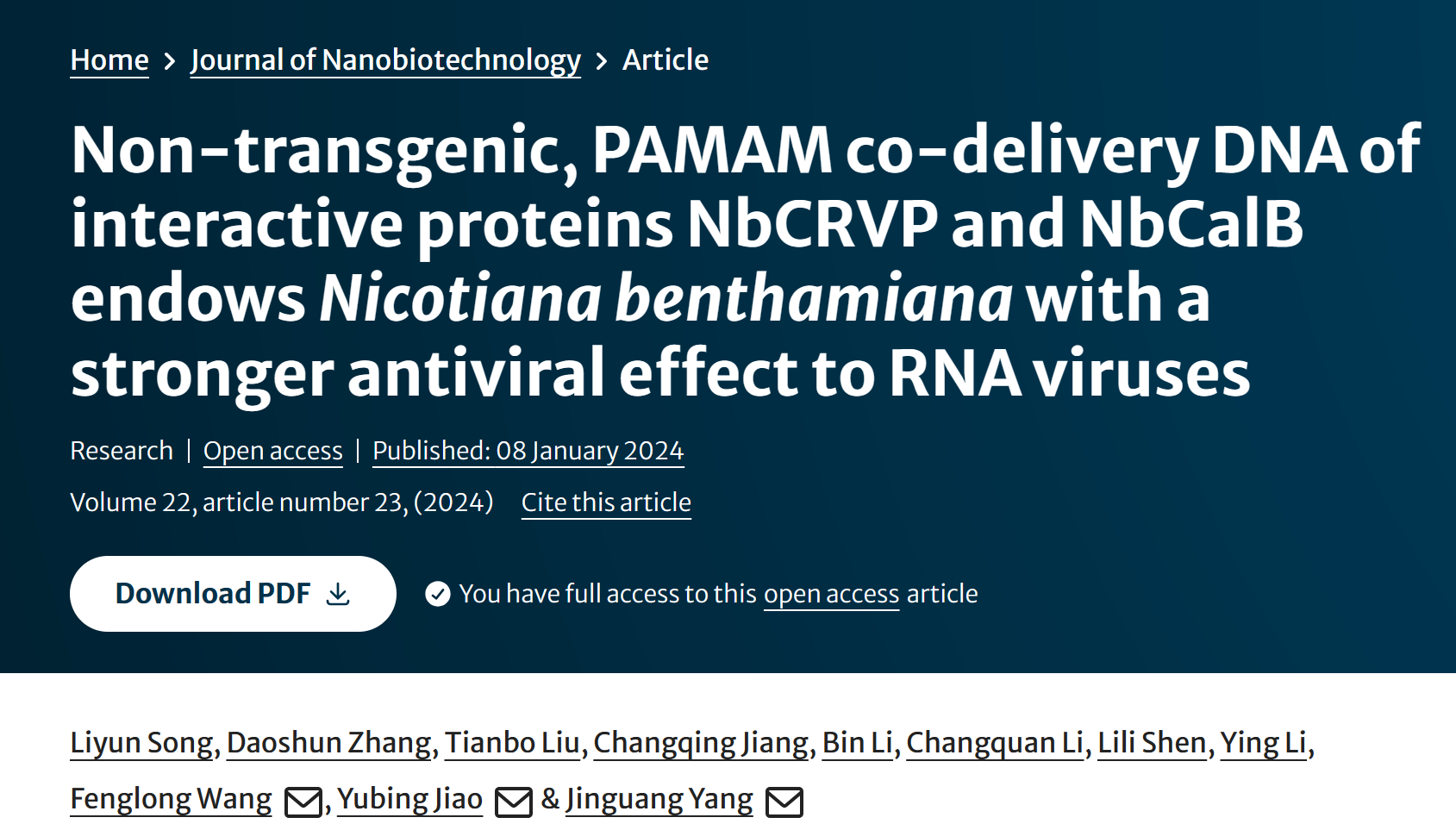 近日,山东省农林职教集团理事长单位潍坊职业学院农林科技学院宋丽云博士在纳米递送互作蛋白防治作物病毒病方面取得重要进展,该研究与中国农业科学院烟草研究所合作完成,相关成果发表在国际权威期刊《Journal of Nanobiotechnology》上,宋丽云博士为文章第一作者。